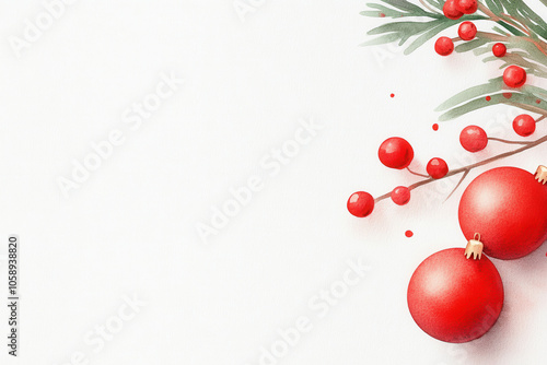 Bright and festive watercolor Christmas background featuring red ornaments and holly leaves, perfect for holiday designs and seasonal greetings