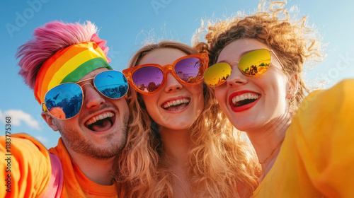 Bright and joyful friends celebrating pride with colorful sunglasses and smiles