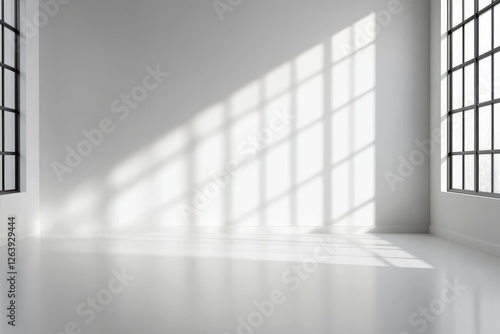 Bright and Minimalist Interior Space with Natural Light and Shadow Play from Large Windows on White Walls and Floor in Contemporary Architecture