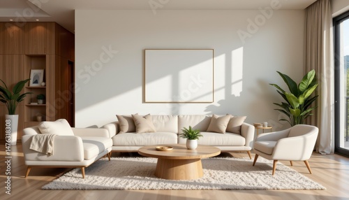 Bright and Modern Living Room with Cozy Sofa, Minimalist Aesthetics, and Natural Light Inviting Atmosphere