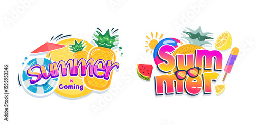 Bright and playful summer vector illustration featuring bold typography, fruits, popsicles, umbrella, and beach elements. Perfect for seasonal ads, social media, kids' party themes, and merchandise.