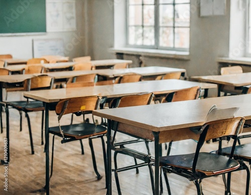 Bright and Quiet Empty Classroom with Rows of Desks and Chairs