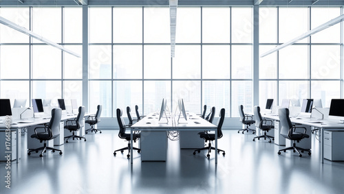 Bright and spacious modern open-plan office interior with empty workstations overlooking a city skyline