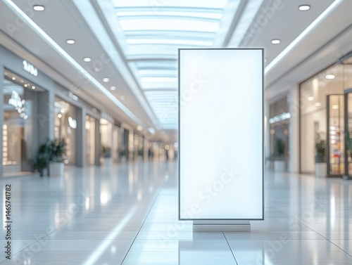 Bright and spacious modern shopping mall interior with a large blank vertical billboard in the center corridor under natural skylight