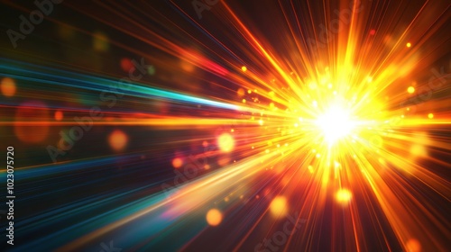 Bright and vibrant lens flare with glowing light rays radiating outward, creating dynamic and energetic atmosphere. This stunning visual evokes sense of excitement and wonder
