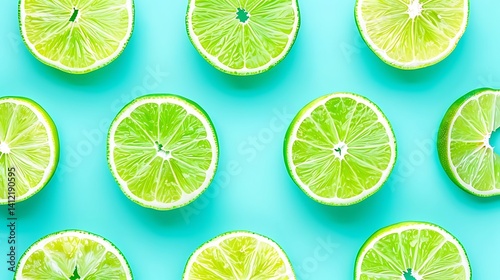 Bright and Vibrant Lime Halves Arranged on a Light Blue Background Pattern