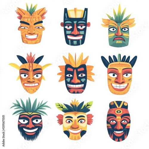 Bright and vibrant set of illustrated tiki masks in various tribal styles, showcasing bold expressions, feathers, and decorative patterns.