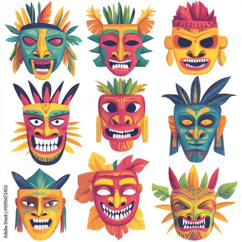 Bright and vibrant set of illustrated tiki masks in various tribal styles, showcasing bold expressions, feathers, and decorative patterns.