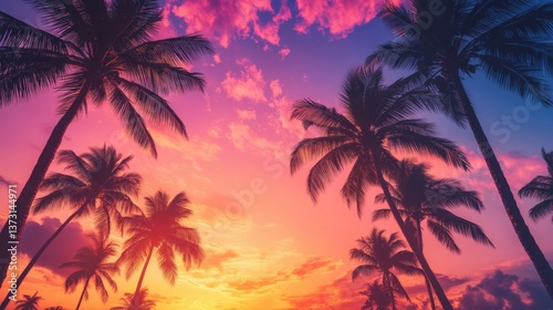 Bright and vibrant sunset over ocean horizon, with silhouette of palm trees along foreground.