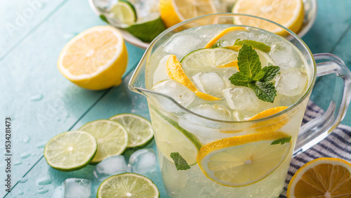 Bright and zesty lemonade presentation with whole lemons, limes, and a minty fresh garnish.