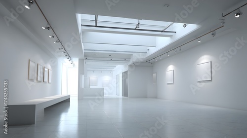 bright art gallery showroom with white walls and spotlighting, 3d realistic render,