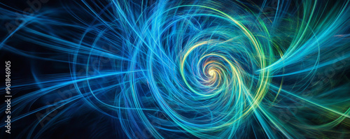Bright blue and green light trails spiraling around a glowing center, creating a sense of motion and energy in a dark space.