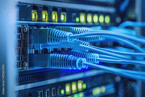 Bright blue cables connect servers as technicians perform maintenance in a bustling data center, showcasing technology and precision during evening hours