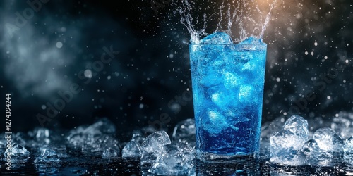 Bright blue drink splashes with ice cubes on dark reflective surface