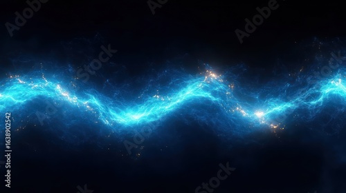 Bright blue electric arc forming a twisting wave pattern with glowing sparks on a dark background, evoking energy and dynamic motion