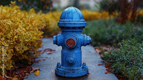 Bright blue fire hydrant standing amidst vibrant autumn foliage in a serene garden setting