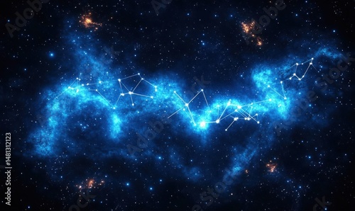 Bright blue glowing nebula with connected constellation stars over a dark starry space background conveying cosmic mystery and vastness