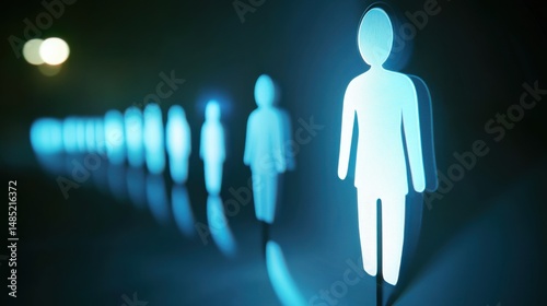 Bright blue illuminated figures line a pathway at night, creating a striking visual experience for passersby in an urban environment