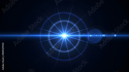 Bright blue lens flare effect on black background abstract digital light beam starburst