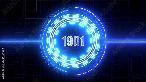 Bright blue neon circle with the year 1901 in the center on a dark digital grid background past number