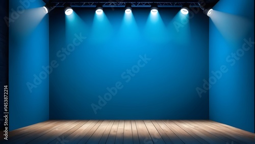 Bright Blue Stage with Spotlight Lighting on Wooden Floor Area