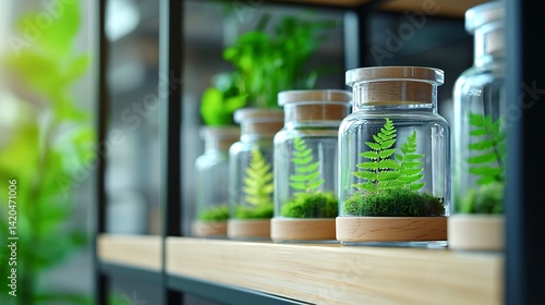 Bright botanical shelf with labeled moss samples and fern cuttings, natural light flooding from side, scientific yet artistic composition, nature-inspired workspace