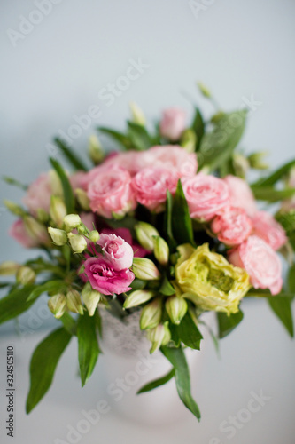 Bright bouquet with roses, eustoma and alstroemeria in white vase. Bouquet on soft blue background