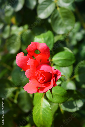 Bright bud of a pink rose with a punched petal, a petal with holes from nature in a home garden, the city of Dnipro, Ukraine.