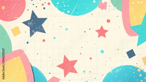 Bright, cheerful abstract background with pastel colors, geometric shapes, and stars; perfect for kids' projects, presentations, or websites.
