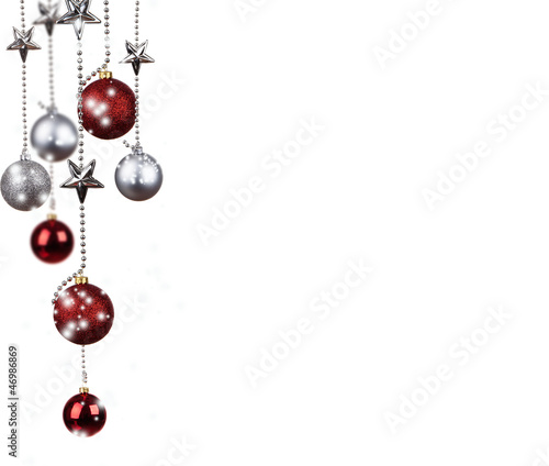 Bright Christmas tree balls with curly ribbons isolated on t