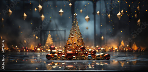 bright christmas tree with decorations on a dark background golden baubles christmas tree with christmas balls, in the style of soft edges and blurred details