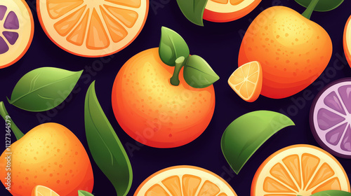 Bright citrus fruits including oranges and lemons with vibrant colors and lush green leaves create lively pattern. This design evokes freshness and energy, perfect for various creative projects