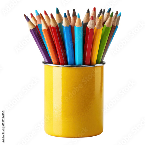 Bright Colored Pencils Overflowing from Yellow Holder on White Background for Creative Projects and School Use