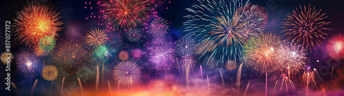 Bright, colorful fireworks exploding in the dark night sky, lighting up the darkness with a vibrant display of light and sound