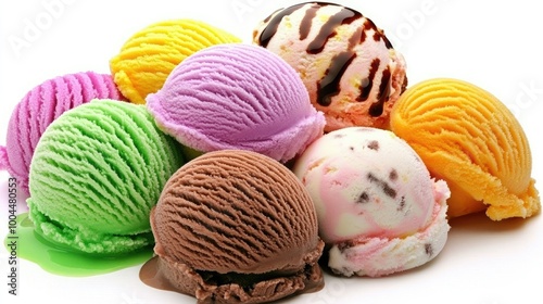 Bright colorful ice cream scoops, arranged in a row on a clean white background, showcasing a variety of flavors.