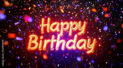 Bright colors illuminate the atmosphere with glowing text that reads Happy Birthday, surrounded by falling confetti, creating a joyful celebration reminiscent of birthday parties
