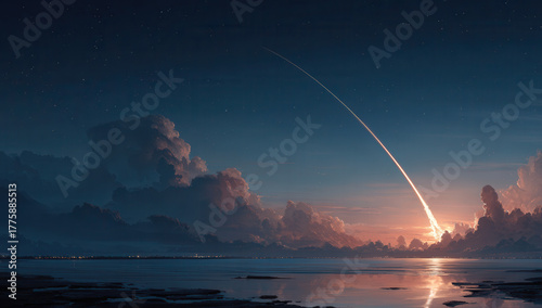 Bright comet streaks across the night sky above a calm ocean with distant city lights shining