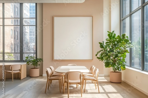 Bright Conference Room with Modern Table, Chairs, Large Windows, and FiddleLeaf Fig