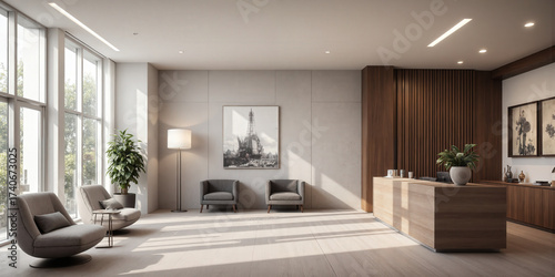 Bright, contemporary reception area with plush armchairs, a wooden reception desk, and light gray walls. Accent lighting from the ceiling