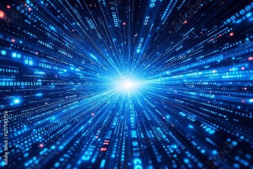 Bright digital burst with binary codes, blue glowing light effect.