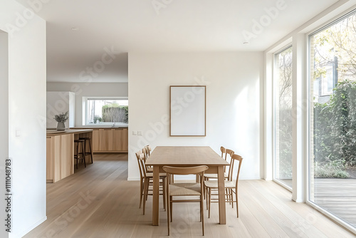 Bright dining room with natural wood furniture, large windows, and an empty poster mock-up frame for a contemporary, light-filled, and elegant interior design