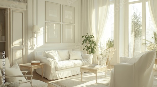Bright, elegant small living room with white furniture, soft beige accents, and light wood touches