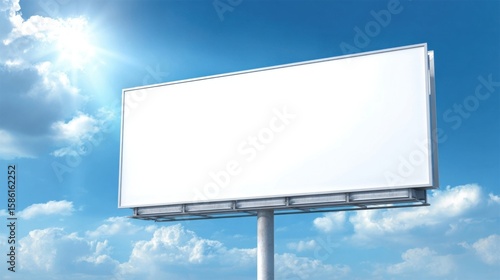 Bright empty blank billboard sign outdoors on metal pole under blue sky with clouds.