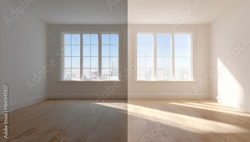 Bright Empty Room with Large Windows Showing City View in Natural Light
