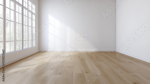 Bright empty room with wooden floor and large windows, minimalist interior design.