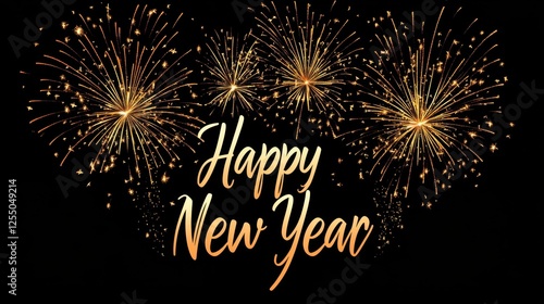 Bright fireworks explode in vivid colors against a midnight sky, "Happy New Year" text glowing in gold.