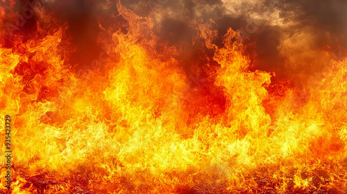 Bright flames engulf the landscape under a cloudy sky, creating a dramatic visual contrast in an outdoor setting