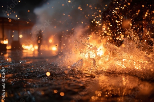 Bright flames rise as water splashes dramatically, creating a vibrant and dynamic atmosphere during an evening celebration