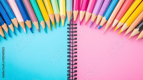 Bright flat lay of colorful pencils and notebooks arranged on a pastel pink and blue background with copy space. Perfect for school or creative projects.