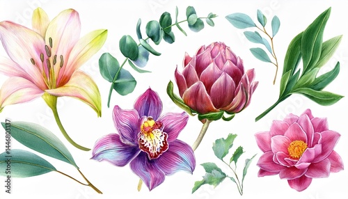 Bright flower set. Botanical painting isolated white background. watercolor lily, peony, or